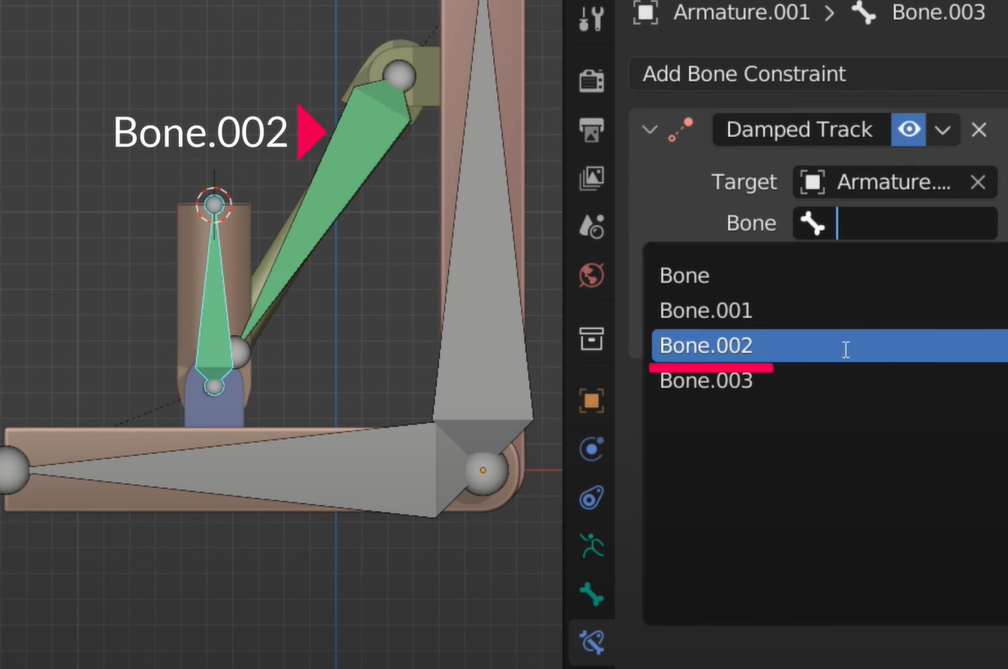 아래뼈를 고르고 뼈에 회전표시가 있는 BoneConstraint Mode로 가서 Damed Track을 추가하고 아마추얼를 선택후 뼈를 선택하는데 이때 따라가야할 상대방 뼈를 잘 선택해야 한다. 아래 그림 보면 하얀액티브된 뼈의 반대쪽 빨간화살표 뼈를 골라야 한다.