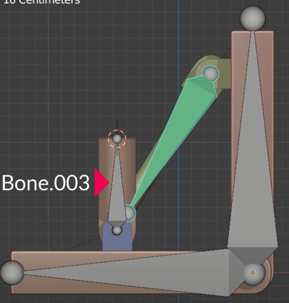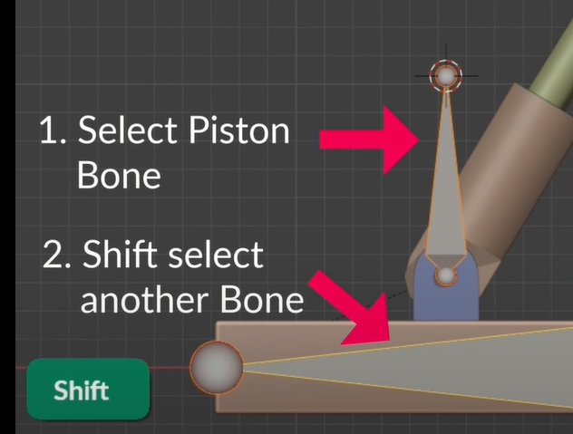 이제 바깥뼈를 움직이면 안의 피스톤이 따라 움직이게 해보겠다. 오브젝트모드에서 위와 동일한 방법으로 먼저 오브젝트를 고르고 SHT를 눌러 아마쳐를 선택후 Pose모드에서 뼈를 고르고 Ctrl-P로 bone을 선택하면된다 다시 오브젝트모드로 나가 나머지도 해준다.