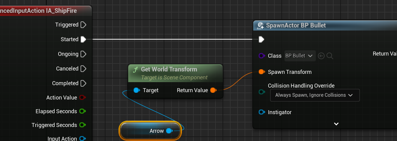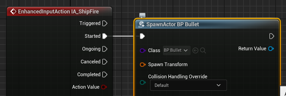 IA_ShipFire 이벤트를 추가하고 Started와 SpawnActor Class를 추가하고 Class를 BP_Bullet을 지정합니다.