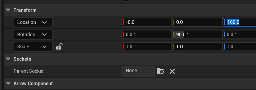 Arrow에서 Get World Transform을 Spawn Transform으로 해주면 Bullet이 Arrow의 방향으로 생성됩니다. 생성된 Bullet을 Forward는 0,0,1이 되므로 위로 날라갑니다. SpawnActordml Collision Handling Override는 Always Spawn으로 충돌시에도 생성되게 해줍니다. 화살표를 여유있게 위로 올린것도 충돌을 피해주기 위해서입니다.
