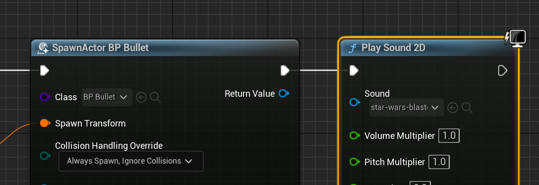 Spawn뒤에 Play Sound2D를 연결해 발사음을 플레이 합니다.