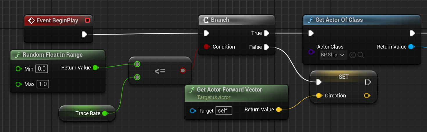 랜덤값이 TraceRate보다 크다면 Direction에 Forward Vector를 적용하고 적다면 BP_Ship을 찾아