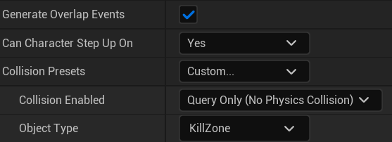BP_KillZone을 열고 콜리젼 설정을 합니다. Kill Zone을 사방으로 겹쳐 놓을 예정이므로 자신도 제외합니다.