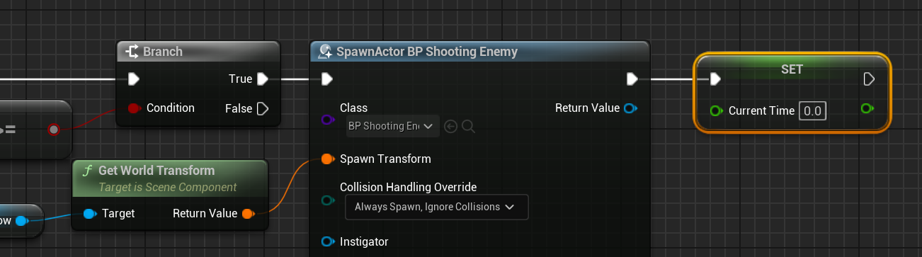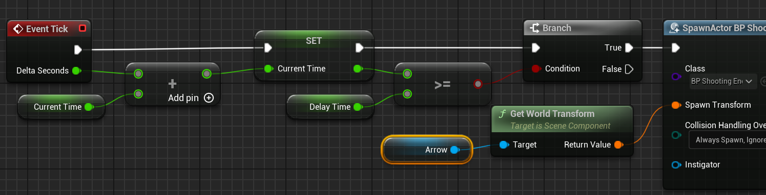 정해진 시간마다 적을 생성하기 위해서는 타이머가 필요합니다. Tick마다 누적되는 CurrentTime과 간격시간인 DelayTime변수를 만들어 CurrentTime이 DelayTime을 초과하면 적을 생성하고