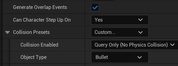 BP_Bullet열고 Box컴포넌트를 선택후 Collision Presets를 Custom ObjectType을 Bullet, Responses를 Enemy만 Overlap으로하고 나머지는 Ignore로 합니다. QueryOnly로도 문제 없지만 나중을 위해 CollisionEnable로 해둡니다.