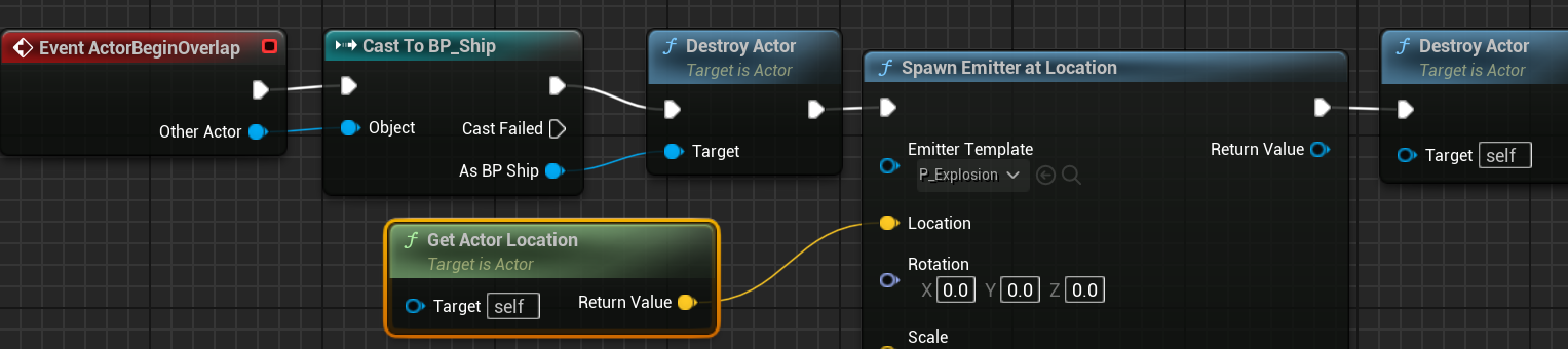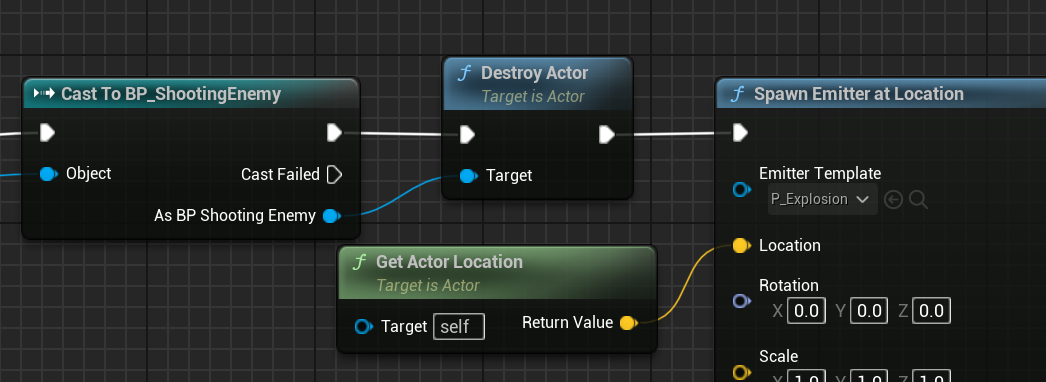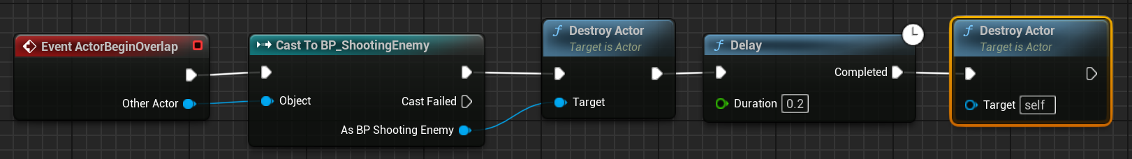 BP_Bullet을 열고 EventActorBeginOverlap Node뒤에 Enemy를 체크하고 파괴합니다. 약간의 딜레이후 자신도 파괴합니다.