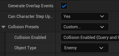 BP_Enemy를 열고 Custom, Object Type을 Enemy, responses는 Player, Bullset을 Overlap나머지를 Ignore로 합니다.