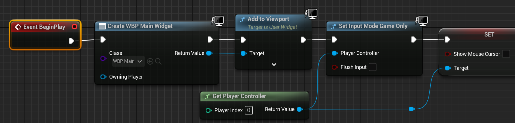 마우스 입력을 받기위해 Show Mouse Cursor 노드도 추가해주고 게임을 포즈시켜줍니다.