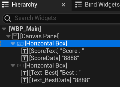 WBP_Main을 열고 HoriozontalBox를 선택하고 Ctrl-D를 누르면 자식까지 복사됩니다. 텍스트를 변경합니다.