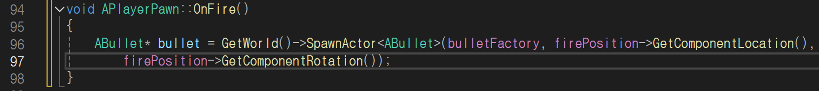 OnFire()함수에서 Bullet을 Getworld()->SpawnActor()로 스폰해줍니다.