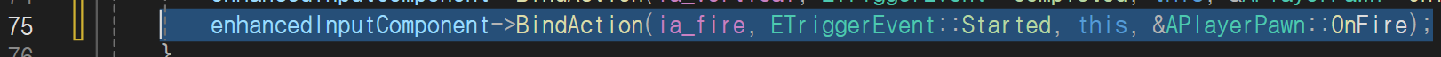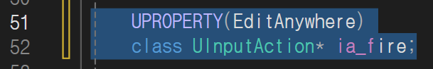 다시 PlayerPawn.h로 이동해 아까 만든 IA_Fire 액션을 받을 변수와 이벤트시 동작할 함수를 만듭니다.