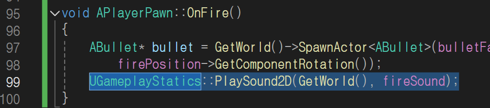 OnFire()함수 안에서 PlaySound2D()로 플레이 시켜줍니다.