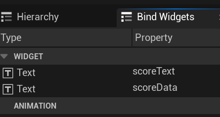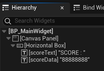 MainWidget클래스를 부모로 BP_MainWidget를 만들고 열어보면 BindWidgets에 scoreText와 scoreData가 보입니다.