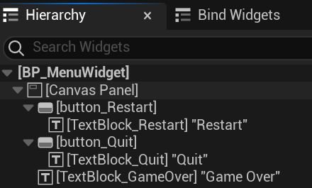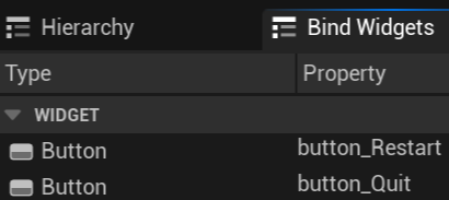 UButton클래스의 변수를 2개 만들고 클릭되면 동작할 함수 Restart(), Quit()도 만듭니다.