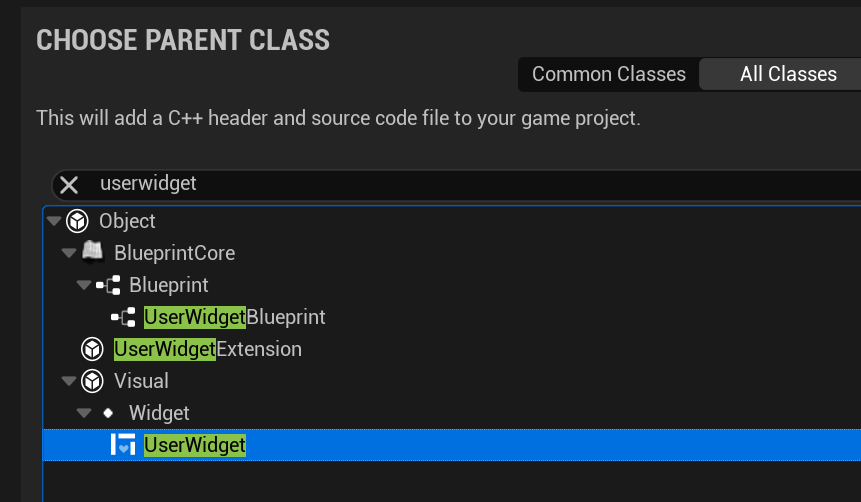 UserWidget을 부모로 C++ 클래스를 만들고 이름을 MenuWidget으로 합니다.