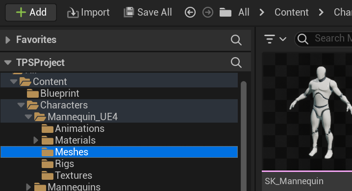 ThirdPerson Pack이 임포트되면 Characters폴더가 생기고 하위 UE4 Meshes아래 SK_Mannequin이 있습니다. 레퍼런스를 카피해 C++상에서 메시를 임포트하는 레퍼런스로 씁니다.