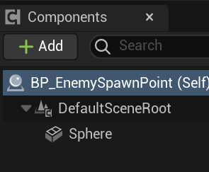 우선 생성한 포인트를 만들 BP_EnemySpawnPoint 블루프린트를 액터를 부모로 만든다.Sphere를 하나 넣고 콜리젼 프리셋은 NoCollision Render는 Hidden In Game으로 게임 플레이시 안보이게 해준다.