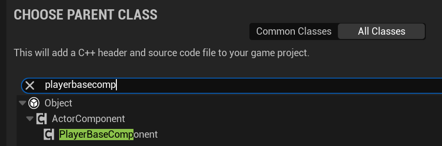 이전에 만든 PlayerBaseComponent를 부모로 PlayerMoveComponent C++ 클래스를 생성합니다.