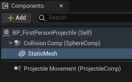 StaticMesh는 BP_FirstPersonProjectile 블루프린트에서 구현되어있다. 이벤트그래프는 특별히 없다.