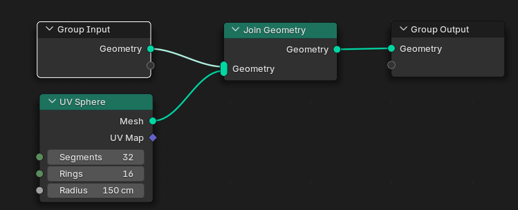 사이에 SHIFT+A>Sphere를 입력 UV Spherer를 추가해주고 연결하면 Group input이 끊어져서 Sphere만 보인다.