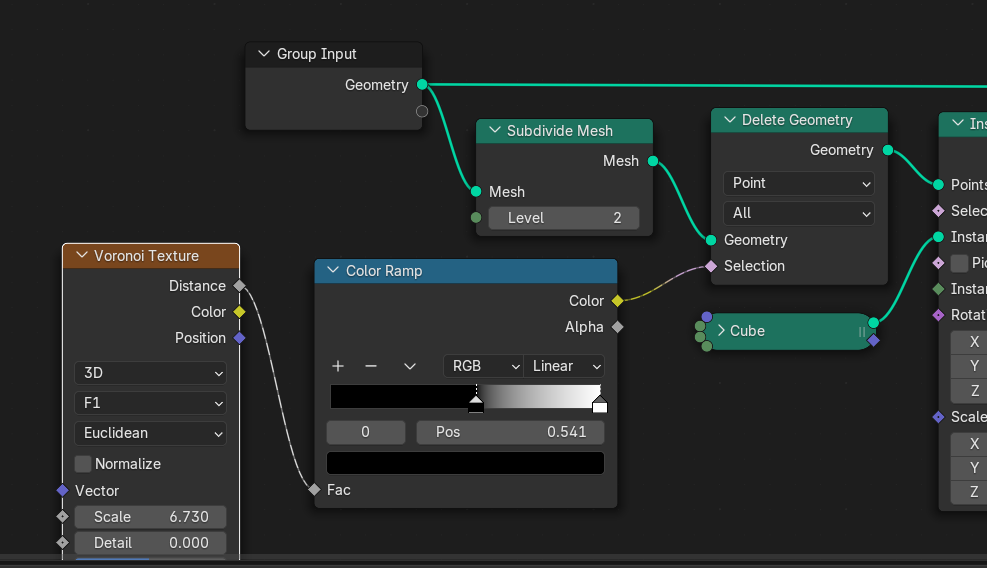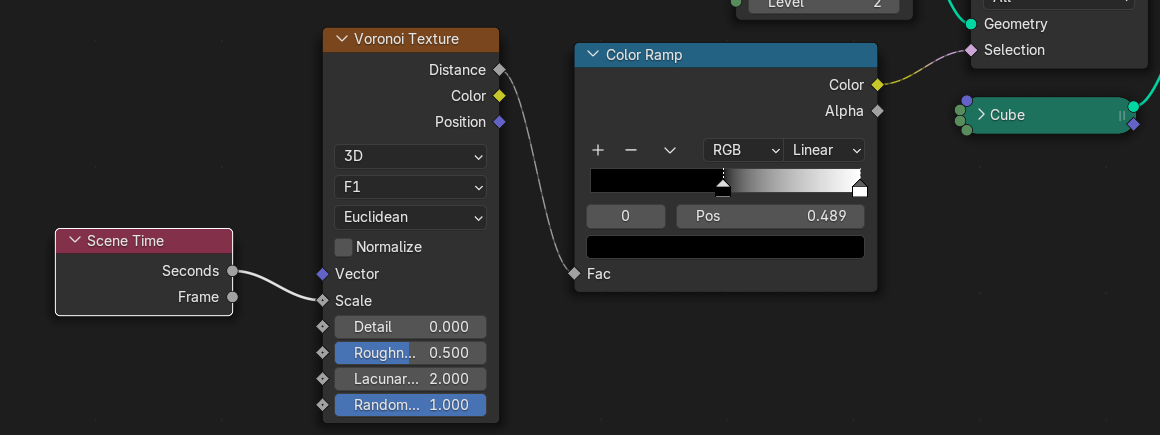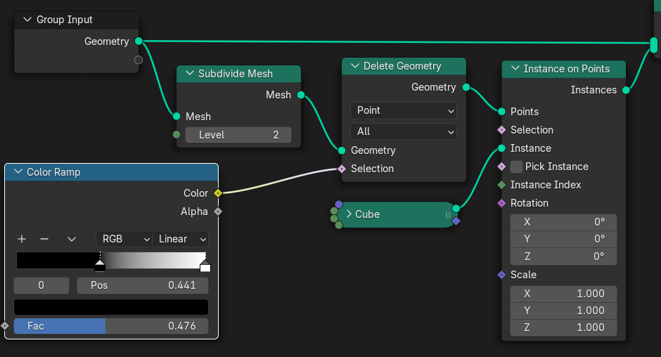 Delete Geometry와 Color Ramp를 연결해보면 Color Ramp의 Pos가 0.5를 넘어가면 작은 큐브들이 보인다.