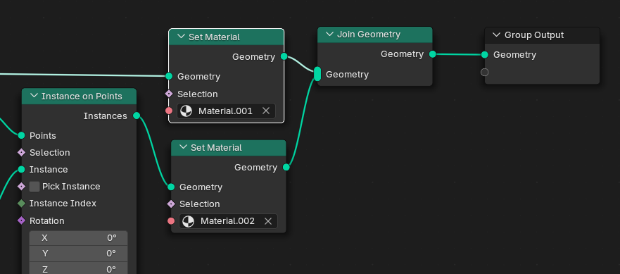 Material을 +를 눌러 2개 만들고 Set Material Node를 2개 추가하여 각각 색을 다르게 해준다.
