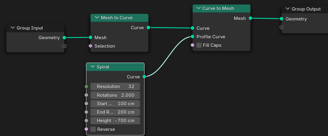 Spiral추가하고 Height를 -7m(-700cm) profile curve에 연결 여기에 연결하는 모양에 따라 curve가 변형된다.