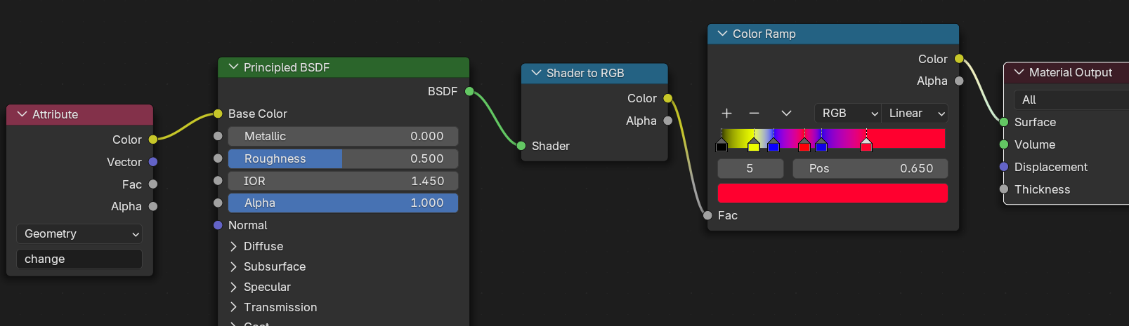 shader에 Attribute를 넣어 연결해준다. Shader to RGB로 변환후 Color Ramp를 거치면 원하는 색을 연출할수 있다.