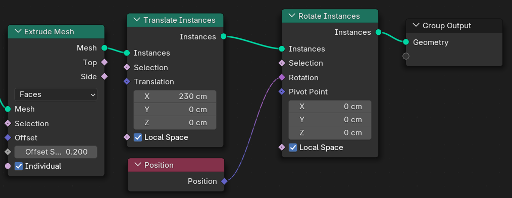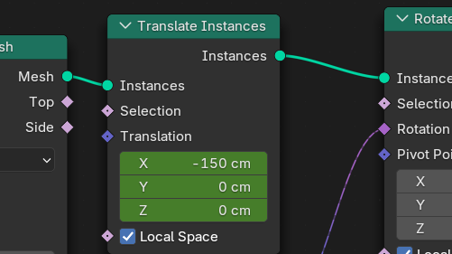 Position이 고정되어 있으니 Translate Instances를 추가하면 x값을 이동시켜보면 Mesh를 이동시킬수 있고 포지션이 변화하므로 캐릭터가 회전하게 된다.
