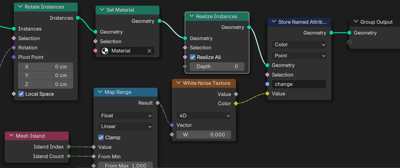Realize Instances로 Instance를 지오메트리 데이터로 바꾸고 Mesh Island로 글자각각 분리한다. white Noise를 Store Named Attribute에 저장해 Shader로 전달할꺼다.