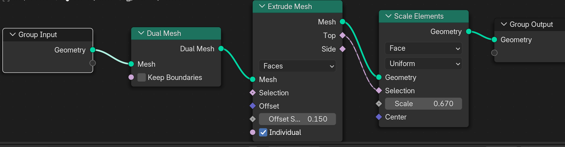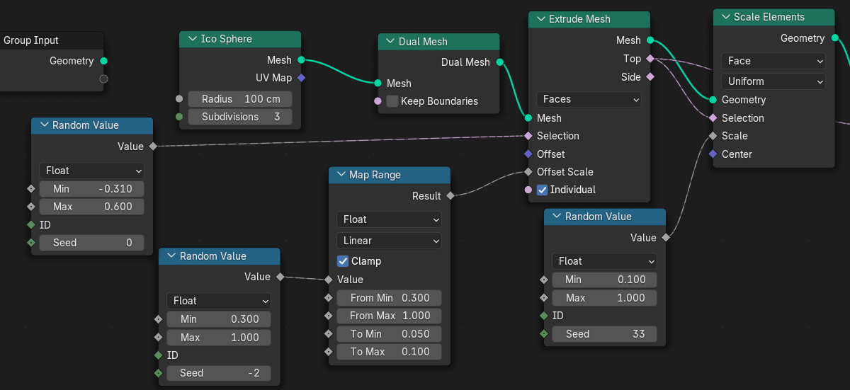 iso sphere를 넣고 지오메트리 노드를 추가하고 Dual Mesh를 추가해 육각형을 만들고 Extrude Mesh를 추가한후 top만 Scale Elements한다 0.7정도 줄여준다.