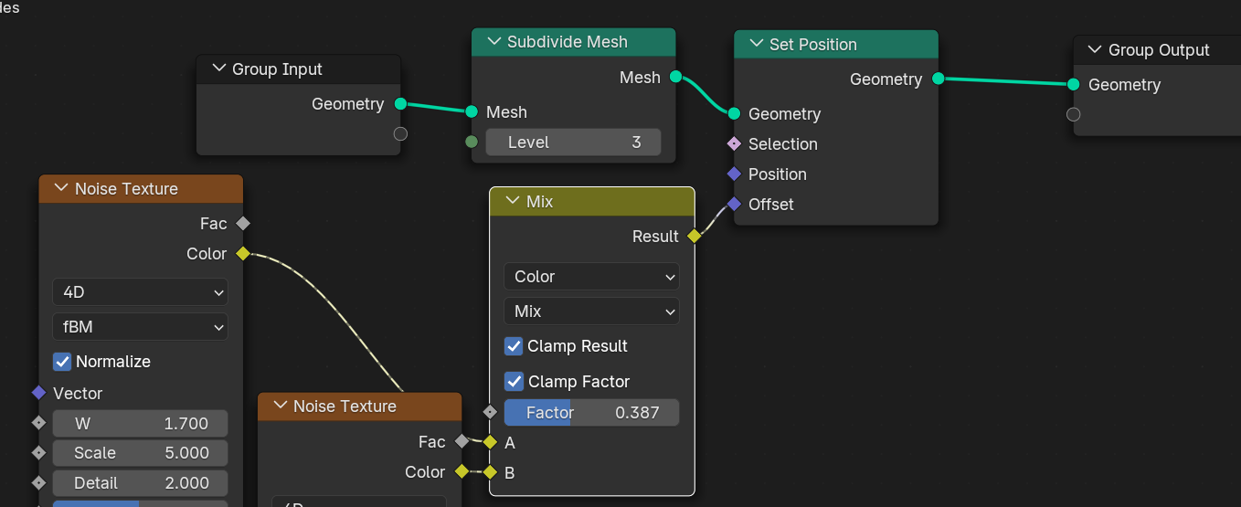 Noise Texture Color를 Offset에 연결후 4D모드 W를 조정하면 옵센이 변경된다. W는 이산적으로 변하기 때문에 Noise Texture를 2개 카피해서 W를 다르게 하고 Mix에서 섞어주고 Factor를 바꿔보면 부드럽게 변화한다