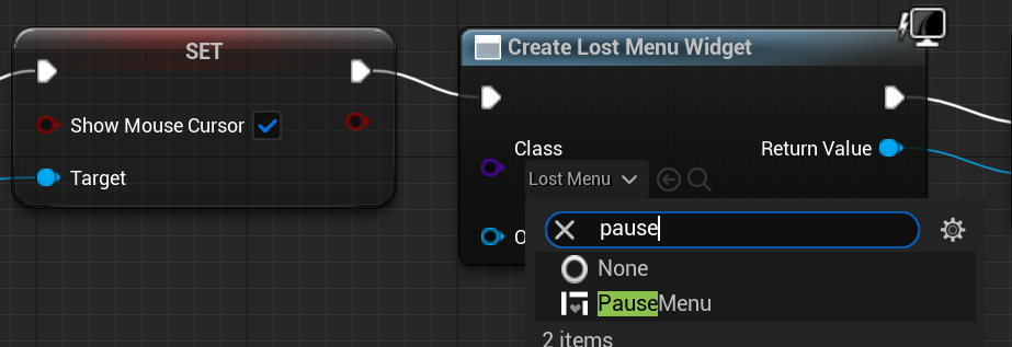 6. CreateWidget노드의 Class를 PauseMenu로 변경하다.