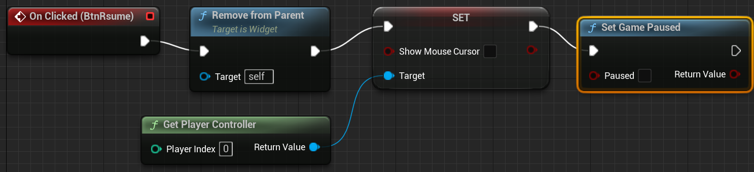 게임을 다시 시작하려면 뷰포트에서 PauseMenu를 제거하고 마우스 커서를 숨긴후 게임 일시 중지를 해제해야 한다.