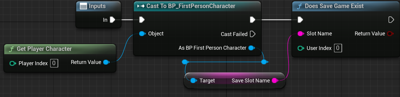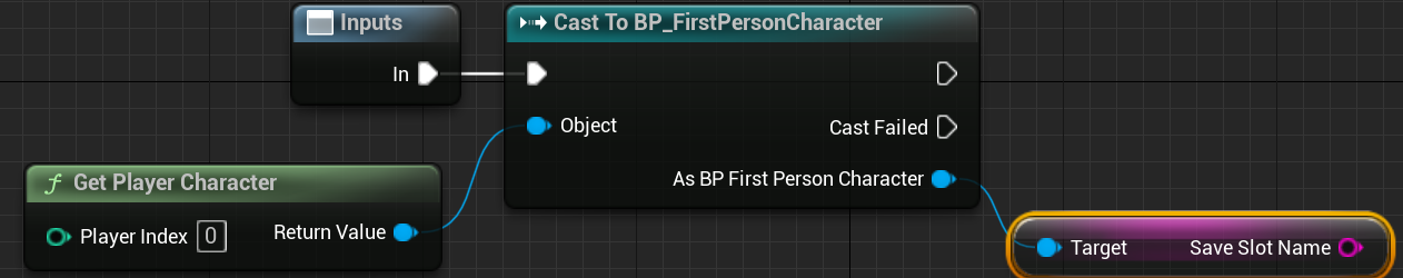 3. 슬롯이름저장 변수의 값을 검색하기 위해 FirstPersonCharacter 인스턴스에 대한 레퍼런스를 얻기위해 GetPlayerCharacter를 추가하고 출력을 끌어 FirstPersonCharacter형변환을 추가한후 GET SaveSlotName노드를 추가한다.
