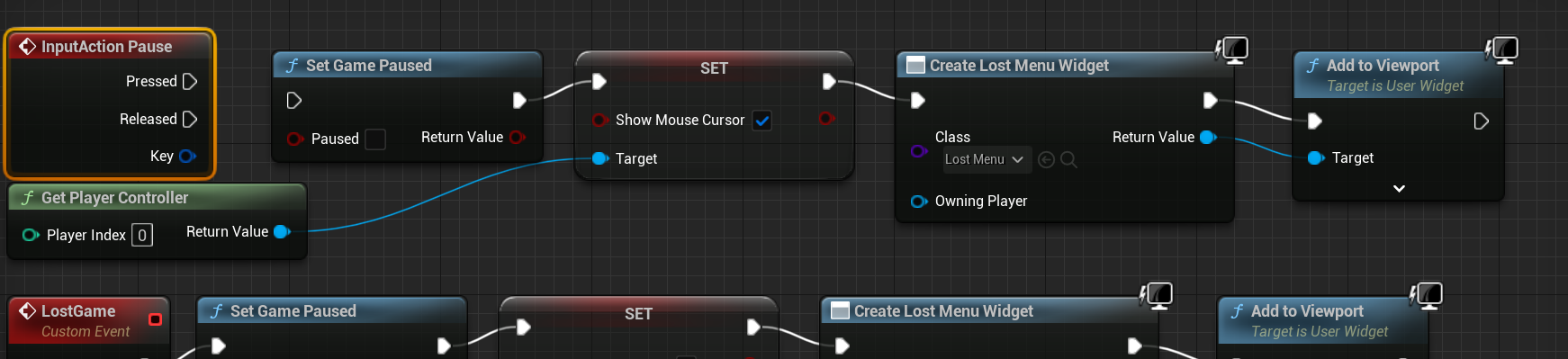 4. 이벤트그래프를 우클릭하고 PauseInput 액션을 검색한 다음 Pause입력 액션 노드를 추가한다. LostGame커스텀 이벤트에서모든 노드를 복사해 Pause입력액션 노드 근처에 붙여 넣는다.