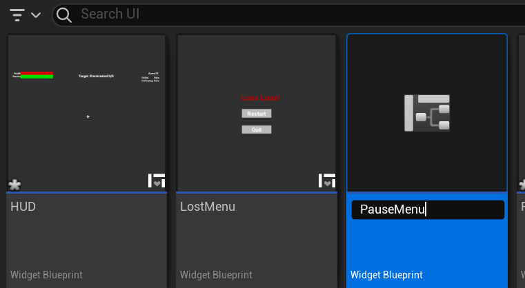 2. 새 블루프린트위젯 이름은 PauseMenu로 이름을 지정한다.
