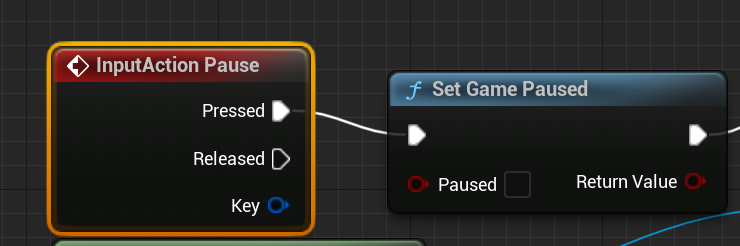 5. InputActionPause출력핀을 SetGamePaused에 연결한다.