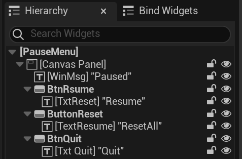 Enter키를 사용해 게임을 일시중지하고 PauseMenu를 연다. 프로젝트 세팅에서 Pause액션 매핑을 추가하고 Pause액션 매핑을 위해 생성된 입력액션 이벤트에 액션을 추가해야 한다.