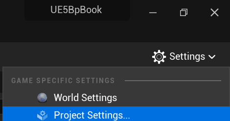 1. 게임 입력 세팅을 변경하려면 툴바모음의 맨 오른쪽 있는 세팅메뉴를 클릭하고 프로젝트 세팅 옵션을 선택한다.